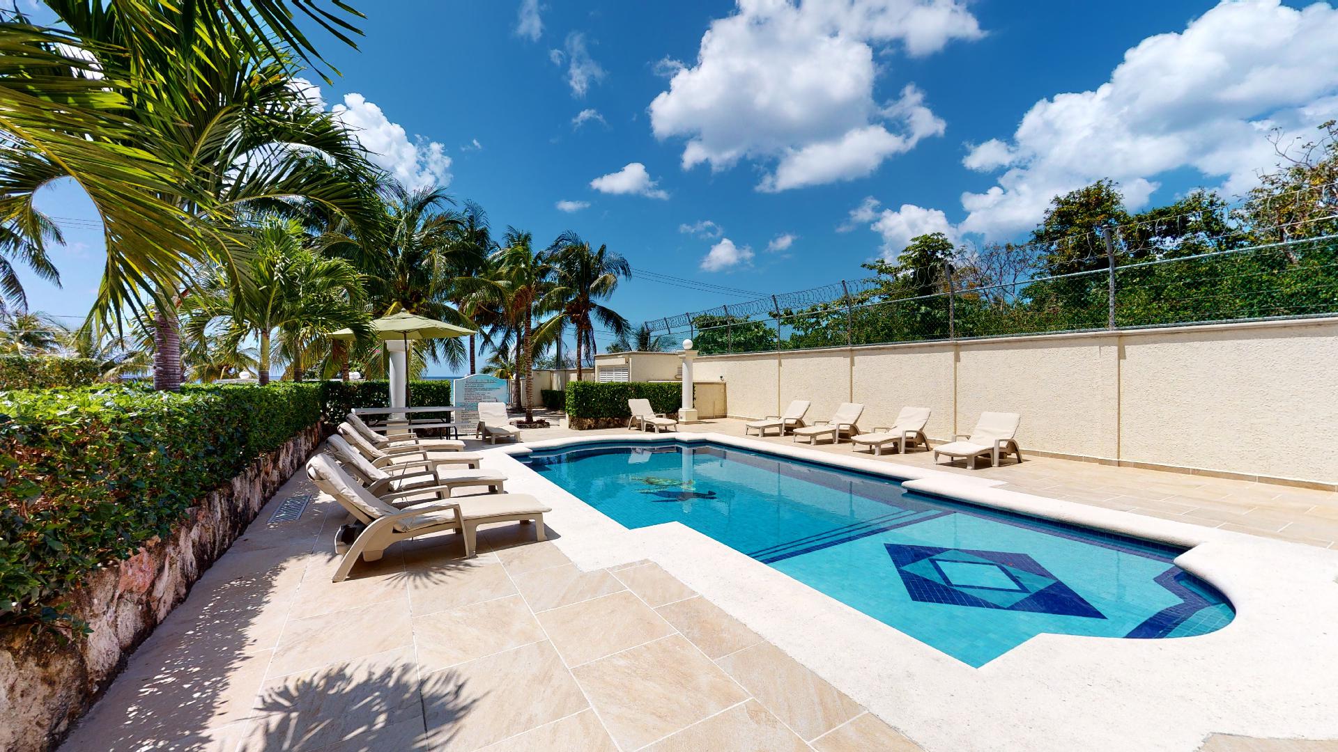 - Poolside patio with lounge chairs